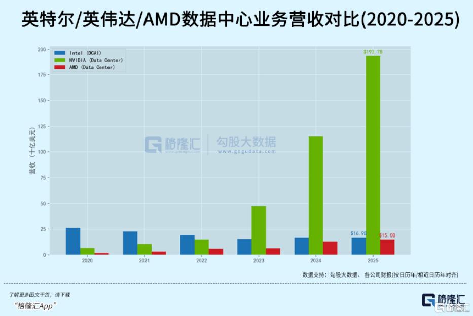 NVIDIA FY2026数据中心收入2159亿美元,毛利率75%。Blackwell时代,英特尔的数据中心业务相比差距已然悬殊。