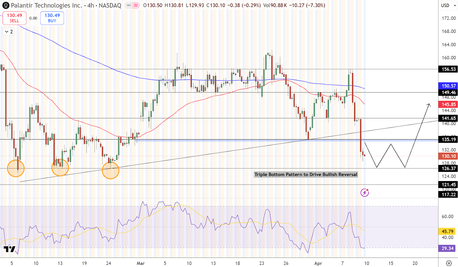 在 4 小时图上,三重底形态位于 126-121 美元区间附近,该区间在历史上已被证明是一个坚实的底部。在经历如此剧烈的抛售之后,股价目前正在该区域接受测试,这有望清洗掉部分仍在坚持的卖方,并可能促使价格企稳。