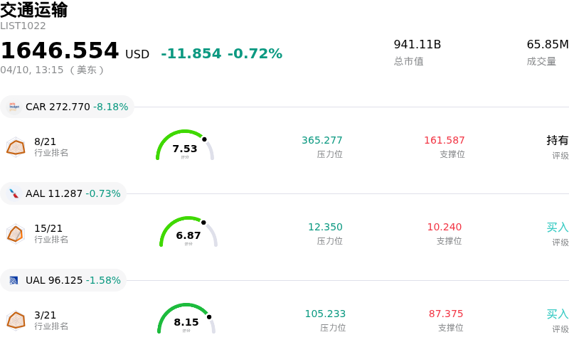 Avis Budget Group Inc (CAR) 盘中下跌8.18%, 所属行业交通运输下跌0.72% ,公司涨幅跑输行业涨幅,行业成交额前三股票 Avis Budget Group Inc (CAR) 下跌 8.18%;American Airlines Group Inc (AAL) 下跌 0.73%;联合航空 (UAL) 下跌 1.58%。
