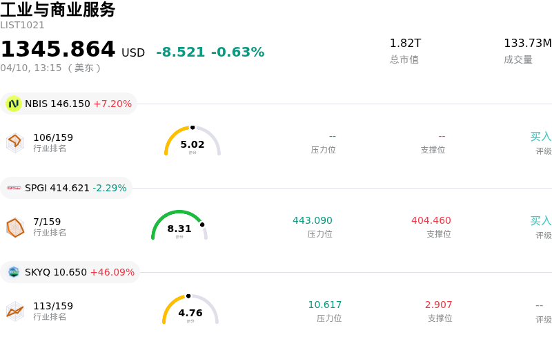 Nebius Group NV (NBIS) 盘中上涨7.20%, 所属行业工业与商业服务下跌0.63% ,公司涨幅跑赢行业涨幅,行业成交额前三股票 Nebius Group NV (NBIS) 上涨 7.20%;标普全球 (SPGI) 下跌 2.29%;Sky Quarry Inc (SKYQ) 上涨 46.09%。
