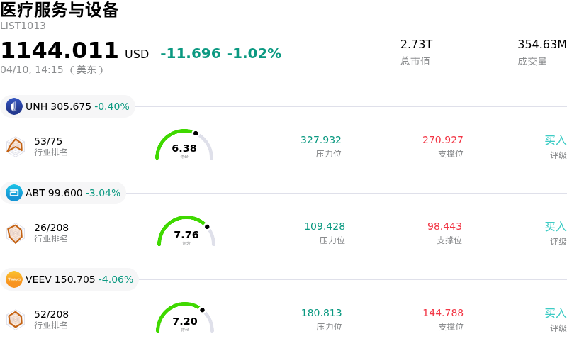 雅培 (ABT) 盘中下跌3.04%, 所属行业医疗服务与设备下跌1.02% ,公司涨幅跑输行业涨幅,行业成交额前三股票 联合健康 (UNH) 下跌 0.40%;雅培 (ABT) 下跌 3.04%;Veeva Systems Inc (VEEV) 下跌 4.06%。