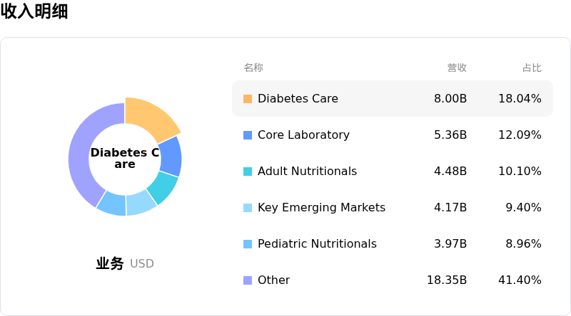雅培 (ABT) 处于医疗服务与设备行业,最新年度营业收入$44.33B,处于行业3,净利润$6.52B,处于行业2。「公司简介」