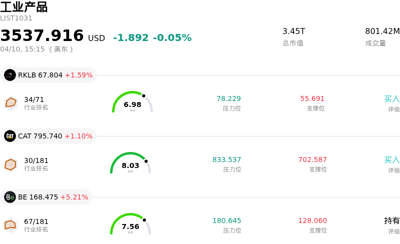 Vertiv Holdings Co (VRT) 盘中上涨3.37%, 所属行业工业产品下跌0.05% ,公司涨幅跑赢行业涨幅,行业成交额前三股票 Rocket Lab USA Inc (RKLB) 上涨 1.59%;Caterpillar Inc (CAT) 上涨 1.10%;Bloom Energy Corp (BE) 上涨 5.21%。