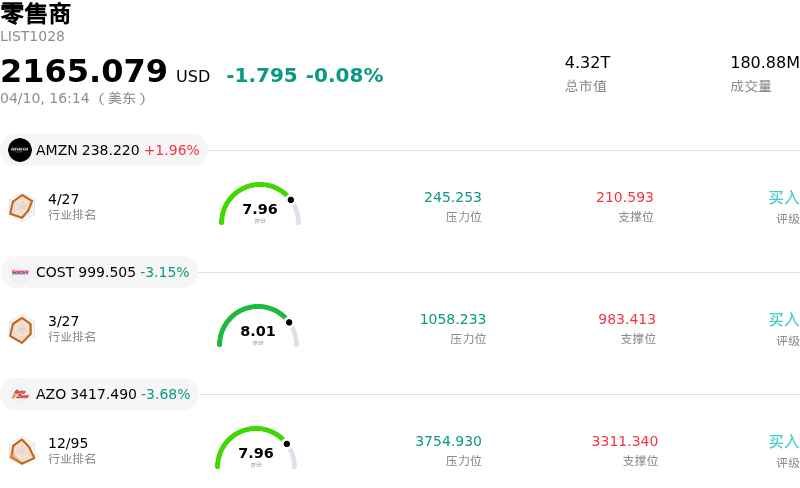 汽车地带 (AZO) 收盘下跌3.68%, 所属行业零售商下跌0.08% ,公司涨幅跑输行业涨幅,行业成交额前三股票 亚马逊 (AMZN) 上涨 1.96%;开市客 (COST) 下跌 3.15%;汽车地带 (AZO) 下跌 3.68%。
