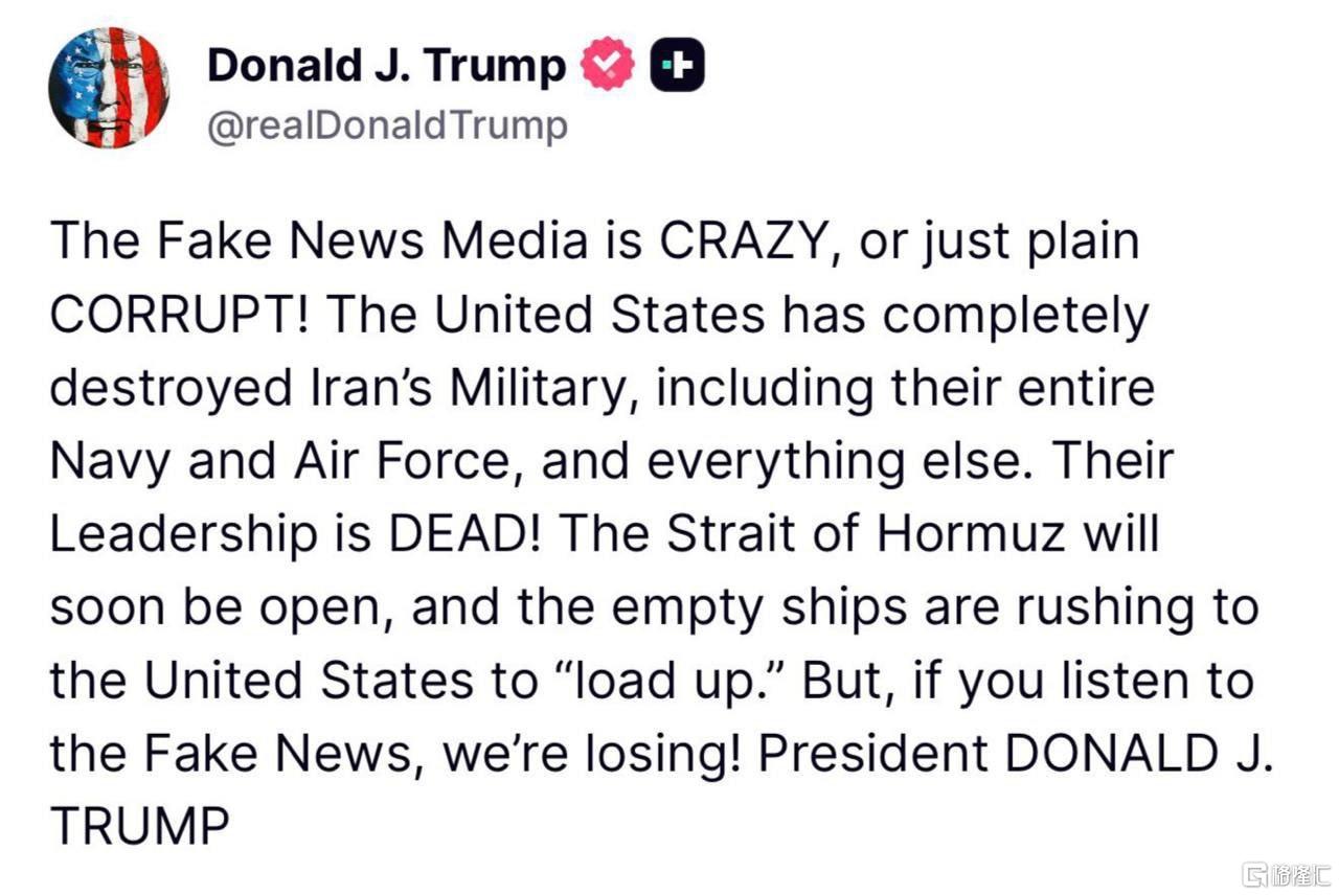 早先,特朗普在社交平台发文称,霍尔木兹海峡很快将恢复通行,空载船只正纷纷赶往美国“装载原油”。