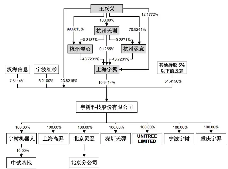 资料显示,王兴兴担任宇树科技董事长、总经理兼首席技术官,为公司的控股股东、实际控制人。王兴兴直接及间接合计持有宇树科技33.3583%股权;同时,在表决权差异安排下,王兴兴直接持股部分的表决权比例为63.55%,结合所控制的上海宇翼股权激励持股平台,合计控制的公司表决权比例为68.78%。按照420亿元的市值粗算,其身家约140亿元。
