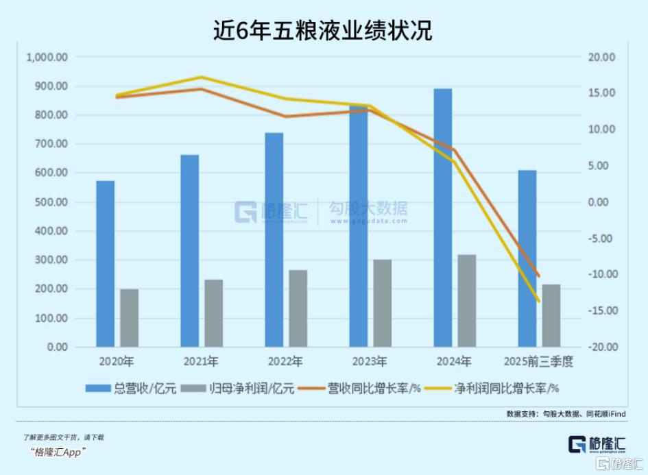 2025年前三季度,五粮液实现营收609.45亿元,同比下降10.26%,归母净利润215.11亿元,同比下降13.72%。