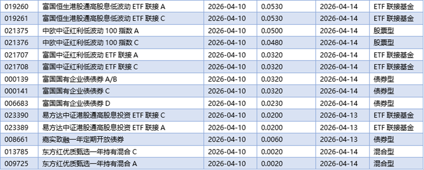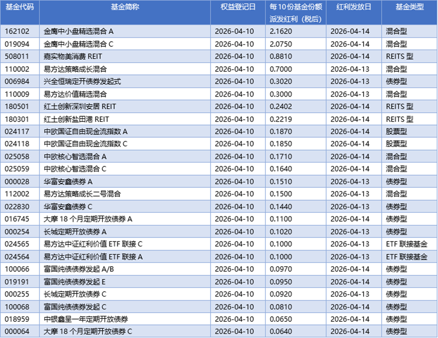 (1)04月10日新发基金共有2只,主要为混合型基金,其中东方阿尔法瑞利混合A募集目标金额达3.00亿元;基金分红39只,多为债券型,派发红利最多的基金是金鹰中小盘精选证券投资基金,每10份基金份额派发红利2.1620元。