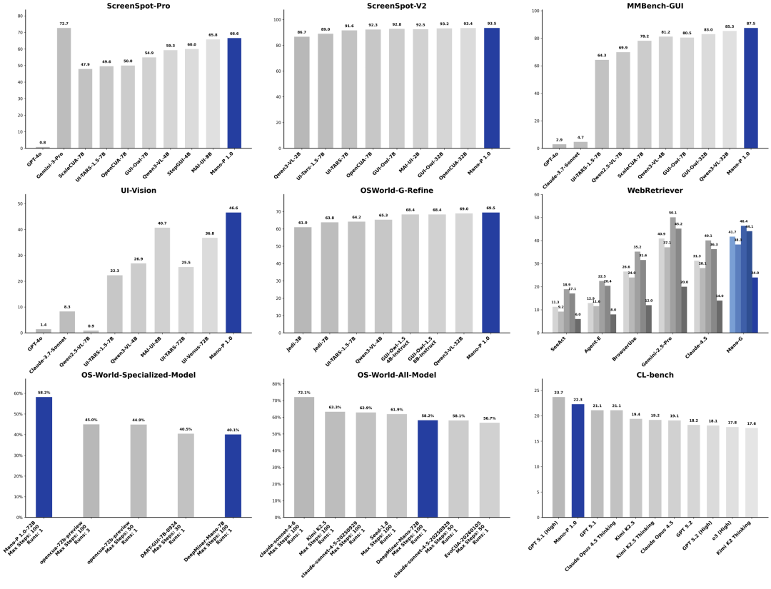 在业界权威的 OSWorld 专有模型基准测试中,Mano-P 72B 模型以 58.2% 的任务成功率位列全球第一,领先第二名 opencua-72b(45.0%)多达 13.2 个百分点 。此外,在 ScreenSpot-V2、MMBench、UI-Vision等评测体系中,Mano-P 同样以绝对优势拔得头筹 。