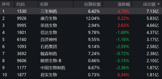 港股通创新药ETF汇添富(159570)标的指数热门成分股涨跌互现:君实生物涨超6%,三生制药涨超4%,荣昌生物涨超2%,康方生物微涨;下跌方面,映恩生物-B跌超5%,石药集团、中国生物制药跌超2%,信达生物、百济神州跌超1%(成分股仅做展示,不作为个股推介)。