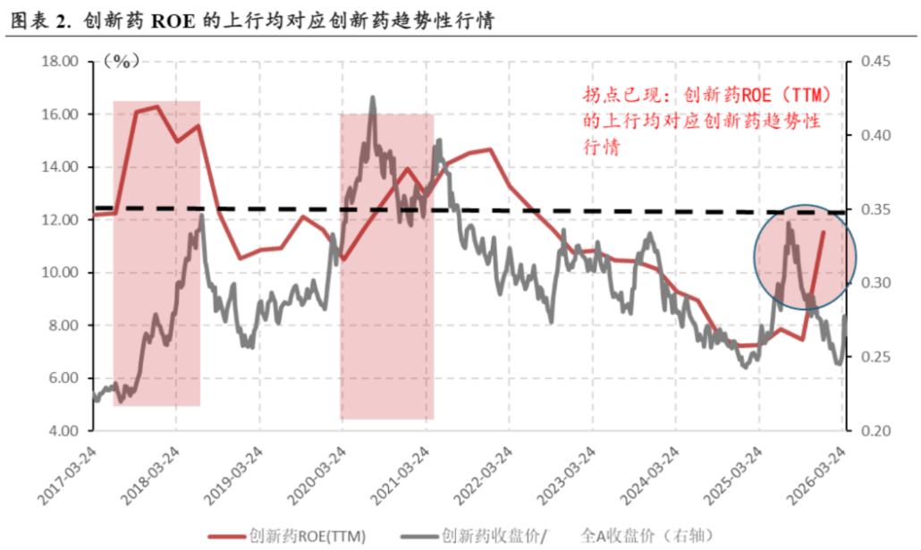 历史规律来看,创新药ROE(TTM)的上行均对应创新药趋势性行情,2025年以来创新药板块在出海高景气 政策扰动消散的催化下,ROE(TTM)呈现出明确的回暖趋势,但市场行情尚未充分反映这一变化,后续创新药成长弹性逻辑有望进一步演绎