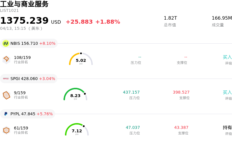 PayPal Holdings Inc (PYPL) 盘中上涨5.76%, 所属行业工业与商业服务上涨1.88% ,公司涨幅跑赢行业涨幅,行业成交额前三股票 Nebius Group NV (NBIS) 上涨 8.10%;标普全球 (SPGI) 上涨 3.04%;PayPal Holdings Inc (PYPL) 上涨 5.76%。