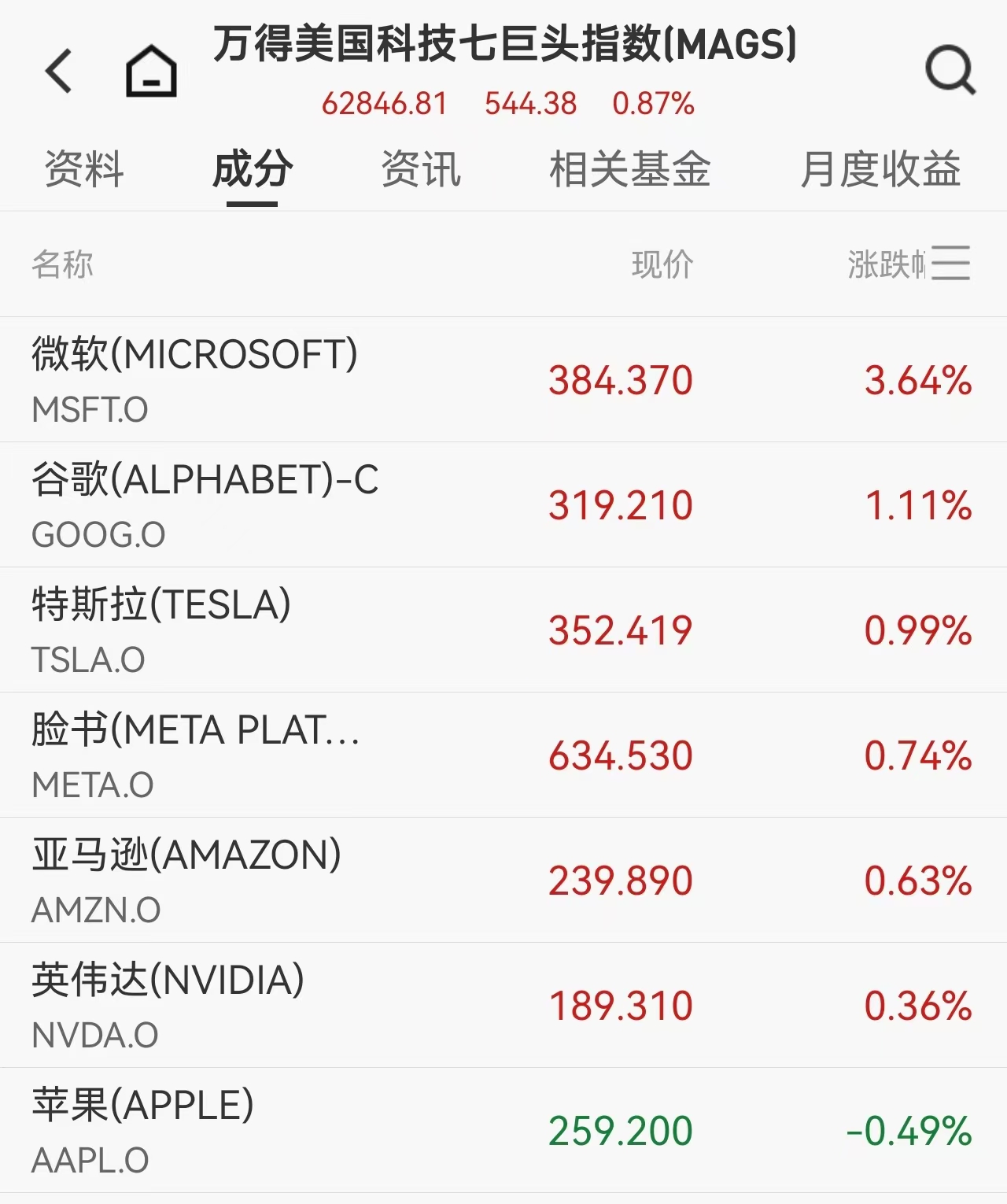 科技股成为引领大盘上涨的主力。万得美国科技七巨头指数上涨0.87%。微软表现最为抢眼,收涨3.64%,高盛分析师维持对其“买入”评级,认为AI开支是公司的长期护城河。谷歌、特斯拉、Meta、亚马逊、英伟达均录得上涨,仅苹果微跌0.49%。