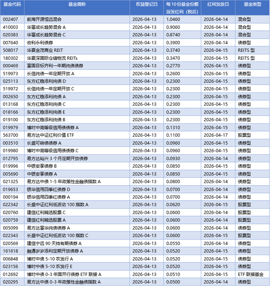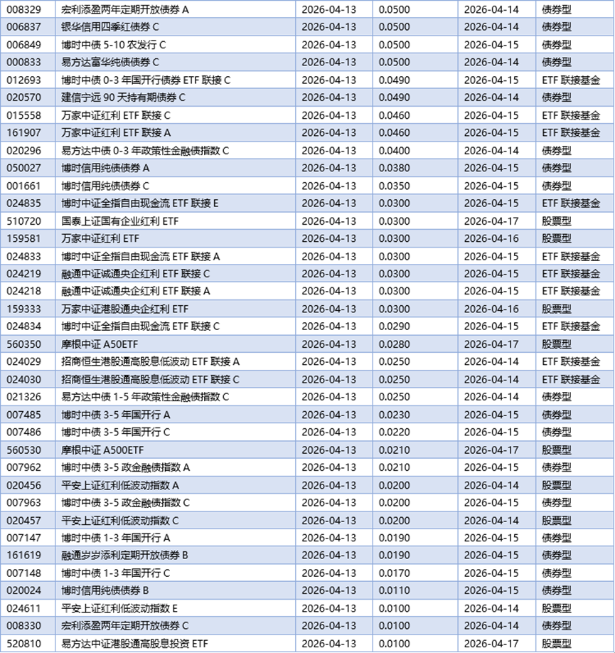 四、04月13日基金分红一览