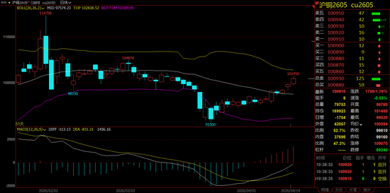 2026年4月14日,沪铜期货走势偏强,早盘高开上涨,日内最高触及101450元/吨,现报100980元/吨,涨幅近2%。目前沪铜价格已收复3月13日以来的全部跌幅,再度强势站上10万关口上方。此前,沪铜曾于3月中下旬持续回调并最低触及91500元/吨。综合多家机构观点指出,近日沪铜价格持续反弹的原因,主要源于宏观地缘局势、供应端扰动以及需求端超预期去库的多重共振。一方面,中东冲突与霍尔木兹海峡受阻引发了市场对生产成本抬升及全球硫酸短缺的担忧,进而加剧了铜矿与湿法冶炼供应减少的预期;另一方面,前期铜价回调显著提振了国内消费,叠加电网投资超预期,下游企业补库意愿强烈,促使社会库存出现大超预期的快速去化。此外,跨市价差走扩引发的美国囤铜预期也为铜价短期上行提供了资金情绪上的推波助澜。