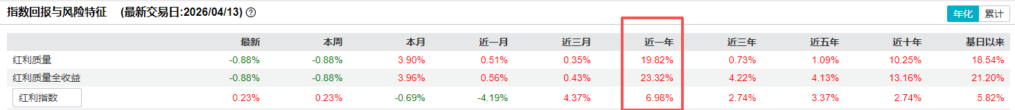 从长期收益归因来看,质量因子的超额贡献非常清晰。以2013年底为基日,中证红利质量全收益指数累计涨幅638.55%,年化18.54%;若按分红再投入口径测算,年化收益率达到22.70%。拉近到近一年,全收益指数涨幅23.32%,同期中证红利为15.71%,红利低波仅6.98%。高弹性的来源在于:当市场情绪回暖时,资金更愿意追逐兼具分红能力和成长质量的公司,而不是单纯的高票息标的。