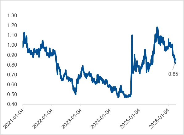 当前A港股证券资产无论是纵向来看,还是横向对比其他行业,估值均处于相对低位水平:截至2026年4月9日,A股非银金融行业近5年估值分位数仅35%,横向对比全市场申万一级行业亦处于明显偏低区间;同时香港证券指数当前市净率(最新报告期)为0.85,已快速回落至接近2024年11月的历史相对低位水平。