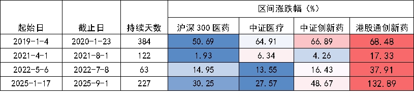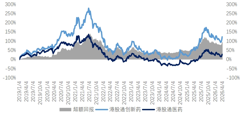 回顾过去,港股通创新药相比港股通医药的超额行情,均由"创新突破 出海兑现"驱动,超额集中发生在两个阶段: