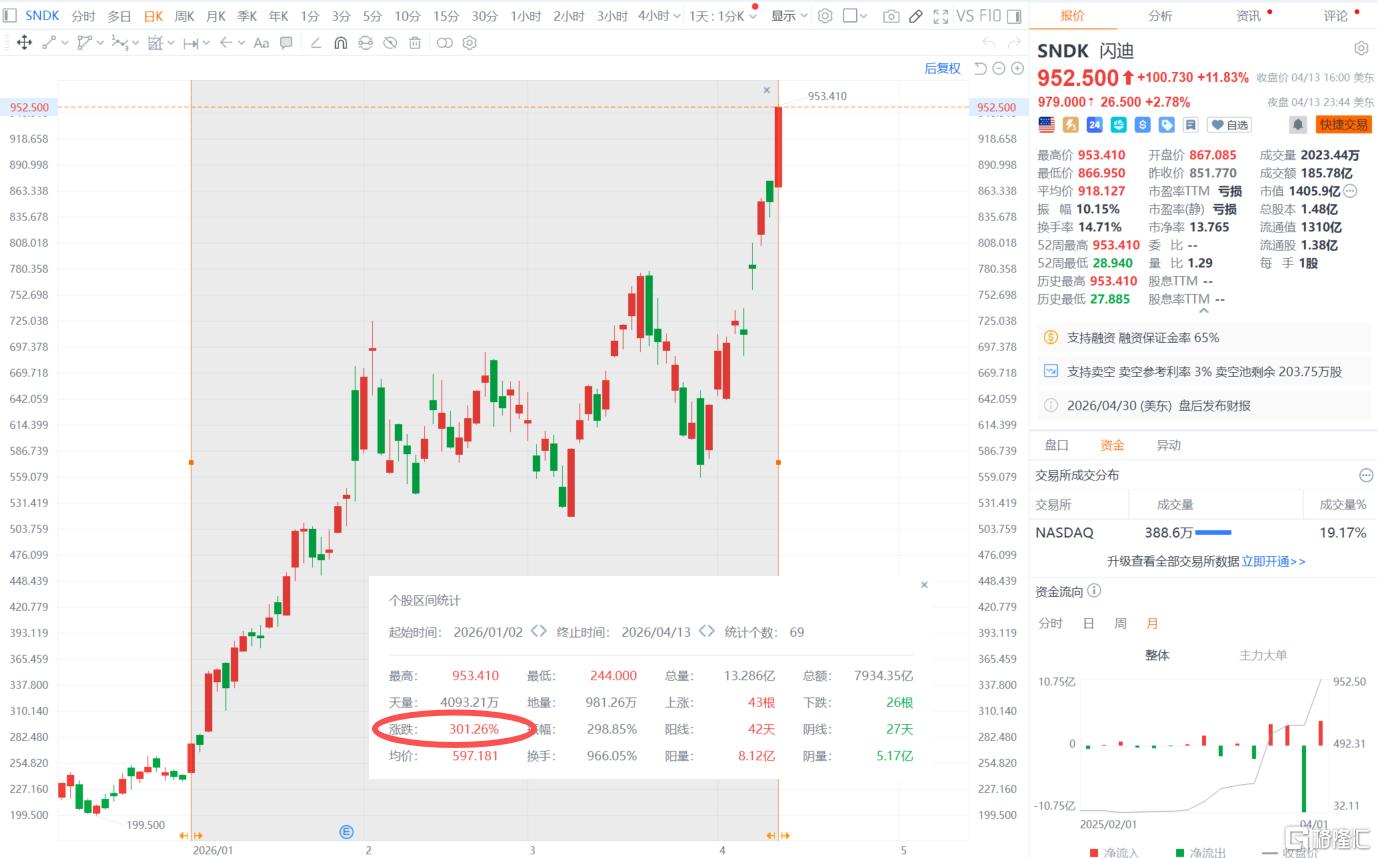 随着AI需求与日俱增下,闪迪年内股价已累计上涨逾300%,过去12个月涨幅高达约2879%,成为市场表现最为突出的个股之一。