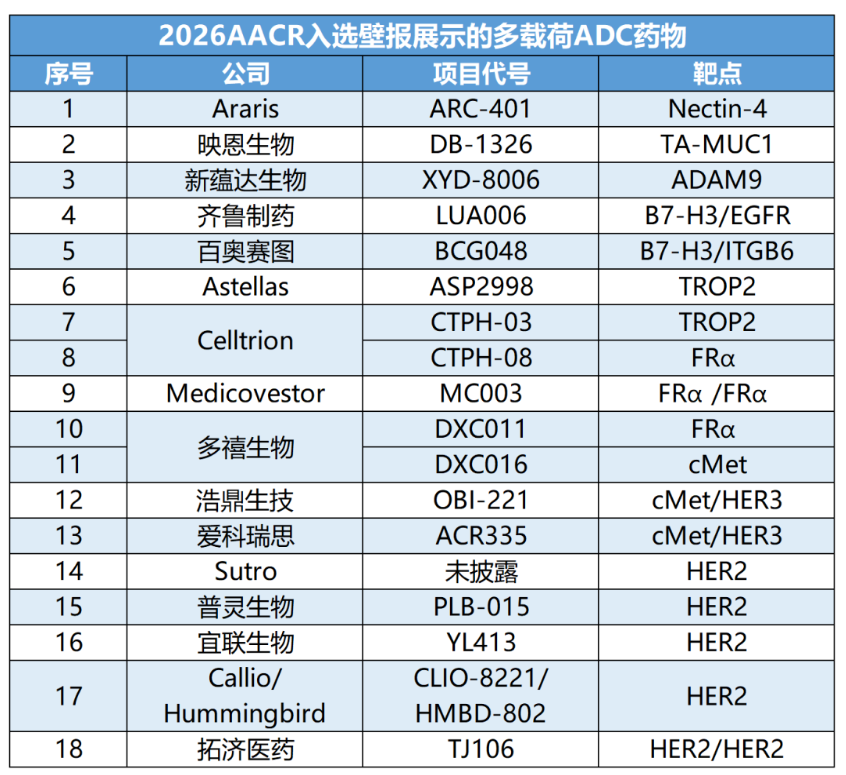 在这场竞赛中,中国药企也已拔得头筹。据统计,今年AACR,将有18个多载荷ADC药物进行壁报展示,包括10家中国药企的11个项目