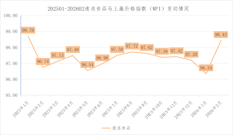 当前,安井食品所处的速冻食品行业已从高速扩张期转入存量洗牌期。行业需求增速放缓背景下,产品同质化竞争加剧,价格“内卷”日益激烈,导致企业利润空间被压缩。据线下零售监测机构马上赢统计,速冻食品价格指数自2025年1月以来持续低于基准线100,2026年1月、2月分别为96.34和98.43,仍处于同比下跌中。