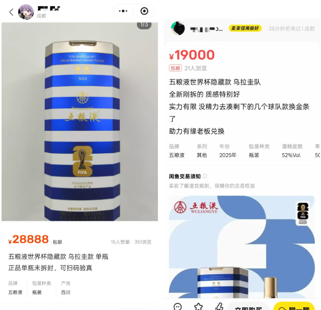 据悉,这套隐藏款产品共8款,对应阿根廷、巴西、德国、法国、乌拉圭、西班牙、意大利、英格兰等世界杯冠军国家队主题产品。市场成交价已从千元区间飙升至数万元不等。在闲鱼、小红书等平台搜索“五粮液世界杯隐藏款”,求购帖十分活跃,热门球队西班牙、意大利等稀缺款已突破4000元。