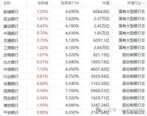 具体来看,国有大行里,交行股息率4.58%、邮储4.21%、工行4.07%、建行4.06%,A股普遍都在4%以上,H股更是能达到5%以上。