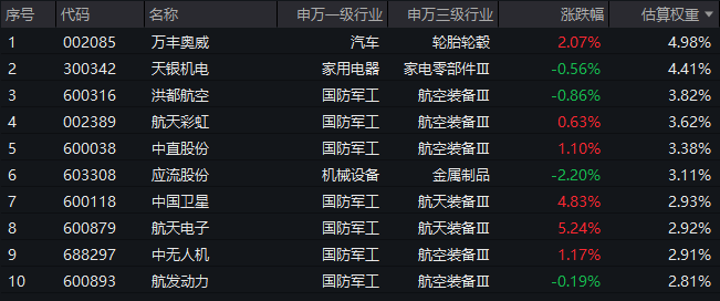 航空ETF汇添富(159257)标的指数成分股多数冲高,航天环宇涨超12%,航天南湖、海特高新等涨停,航天电子涨超5%,中国卫星涨超4%,万丰奥威涨超2%,中直股份、中无人机等跟涨,天银机电、洪都航空等回调。
