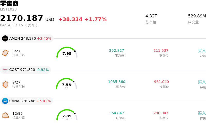亚马逊 (AMZN) 盘中上涨3.45%, 所属行业零售商上涨1.77% ,公司涨幅跑赢行业涨幅,行业成交额前三股票 亚马逊 (AMZN) 上涨 3.45%;开市客 (COST) 下跌 0.92%;Carvana Co (CVNA) 上涨 5.42%。