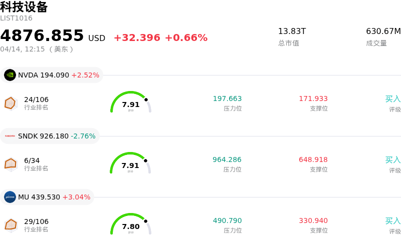 美光科技 (MU) 盘中上涨3.04%, 所属行业科技设备上涨0.66% ,公司涨幅跑赢行业涨幅,行业成交额前三股票 英伟达 (NVDA) 上涨 2.52%;闪迪 (SNDK) 下跌 2.76%;美光科技 (MU) 上涨 3.04%。