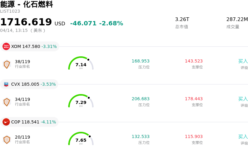 ConocoPhillips (COP) 盘中下跌4.11%, 所属行业能源 - 化石燃料下跌2.68% ,公司涨幅跑输行业涨幅,行业成交额前三股票 埃克森美孚 (XOM) 下跌 3.31%;雪佛龙 (CVX) 下跌 3.53%;ConocoPhillips (COP) 下跌 4.11%。
