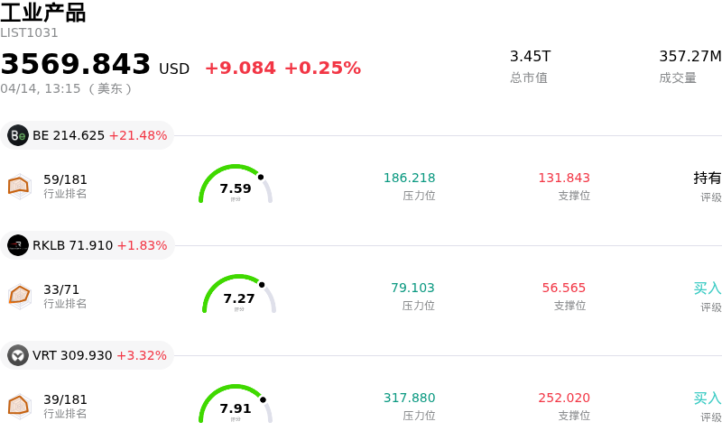 Vertiv Holdings Co (VRT) 盘中上涨3.32%, 所属行业工业产品上涨0.25% ,公司涨幅跑赢行业涨幅,行业成交额前三股票 Bloom Energy Corp (BE) 上涨 21.48%;Rocket Lab USA Inc (RKLB) 上涨 1.83%;Vertiv Holdings Co (VRT) 上涨 3.32%。