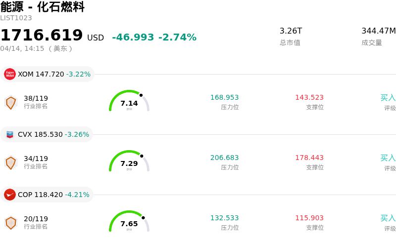 TotalEnergies SE (TTE) 盘中下跌3.23%, 所属行业能源 - 化石燃料下跌2.74% ,公司涨幅跑输行业涨幅,行业成交额前三股票 埃克森美孚 (XOM) 下跌 3.22%;雪佛龙 (CVX) 下跌 3.26%;ConocoPhillips (COP) 下跌 4.21%。