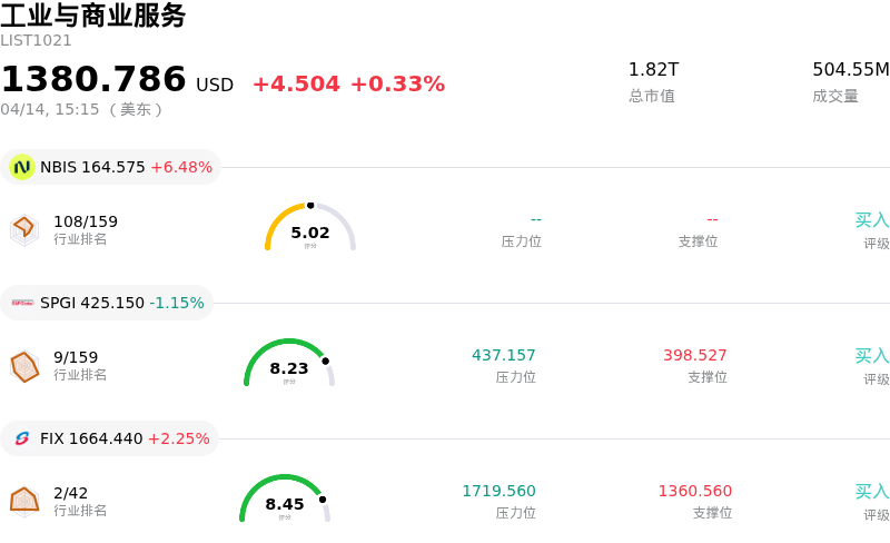 Nebius Group NV (NBIS) 盘中上涨6.48%, 所属行业工业与商业服务上涨0.33% ,公司涨幅跑赢行业涨幅,行业成交额前三股票 Nebius Group NV (NBIS) 上涨 6.48%;标普全球 (SPGI) 下跌 1.15%;Comfort Systems USA Inc (FIX) 上涨 2.25%。
