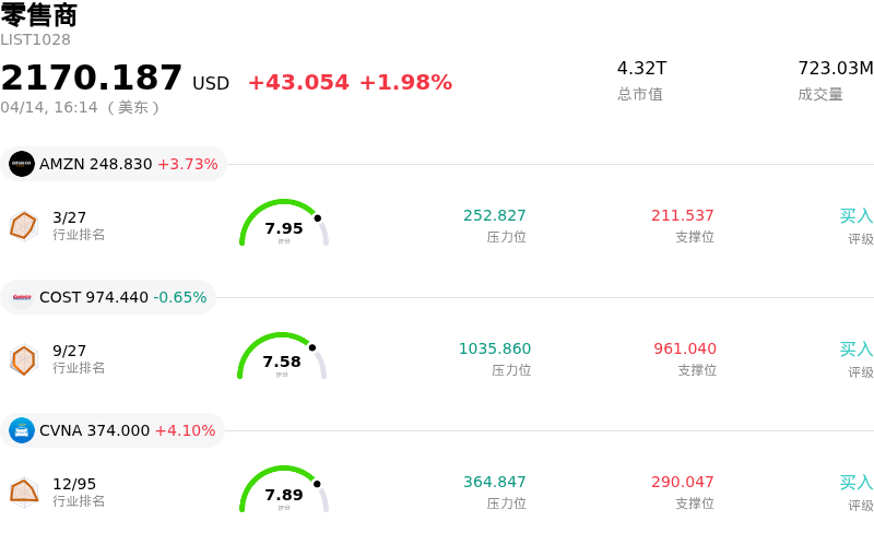 京东 (JD) 收盘上涨7.74%, 所属行业零售商上涨1.98% ,公司涨幅跑赢行业涨幅,行业成交额前三股票 亚马逊 (AMZN) 上涨 3.73%;开市客 (COST) 下跌 0.65%;Carvana Co (CVNA) 上涨 4.10%。
