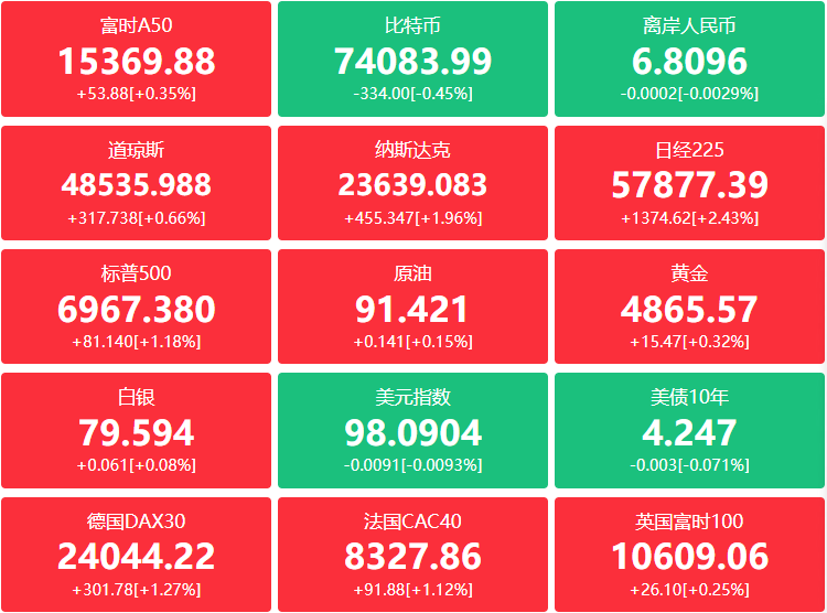 期货:现货黄金涨2.12%报4840.60美元,黄金期货涨2.02%报4863.80美元;现货白银涨5.30%报79.6131美元;白银期货涨5.42%报79.765美元;铜期货涨1.60%报6.146美元;现货铂金涨1.52%,现货钯金涨0.74%;原油期货跌7.80美元,跌幅7.87%报91.28美元;布伦特原油跌4.57美元,跌幅4.60%报94.79美元;中东Abu Dhabi Murban原油跌2.45%报100.80美元;天然气期货报2.599美元,汽油期货报3.0395美元,取暖油期货报3.6243美元。