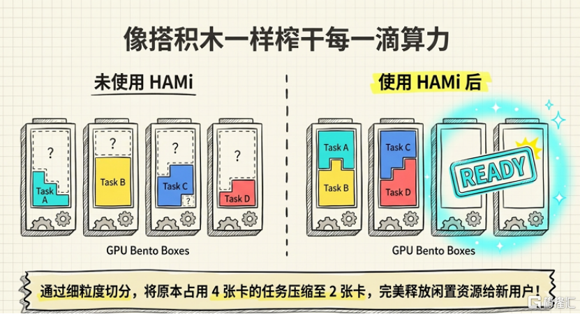 在传统模式下,GPU采购成本高昂,若每个任务都独占一张卡,大量显存与算力会长期处于闲置状态,不仅造成资源浪费,更让企业AI项目的成本居高不下。HAMi vGPU通过Virtual VRAM技术,可将单卡显存等效扩展至256GB,突破物理硬件的显存上限,让企业无需采购高端大显存GPU,就能满足大模型训练、推理等显存密集型任务的需求,大幅降低硬件采购门槛。通过这种细粒度切分,原本需要占用4张卡的任务可被压缩至2张卡内完成,完美释放闲置资源承接新业务。