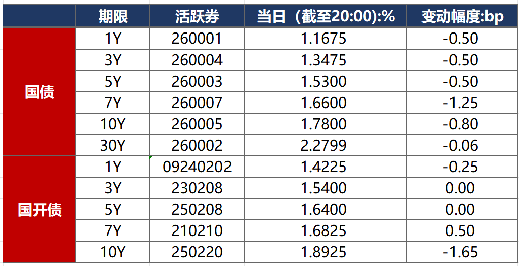 4月14日公布的3月出口数据走弱,叠加市场对超长债供需结构改善的预期持续,债市延续走强。截至北京时间20:00,10年期国债活跃券260005收益率下行0.80bp至1.7800%,10年期国开债活跃券250220收益率下行1.65bp至1.8925%。