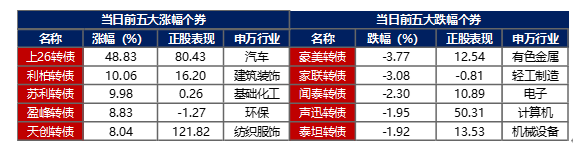 【转债市场主要指数集体跟涨】 4月14日,转债市场跟随权益市场有所反弹,中证转债、上证转债、深证转债分别收涨0.94%、0.92%、0.99%。转债市场成交额713.50亿元,较前一交易日放量84.59亿元。转债市场个券多数上涨,354只转债中,286只收涨,48只下跌,20只持平。当日上涨个券中,新上市上26转债涨超48%,存量个券中利柏转债涨超10%;下跌个券中,豪美转债、家联转债跌逾3%,闻泰转债跌逾2%。