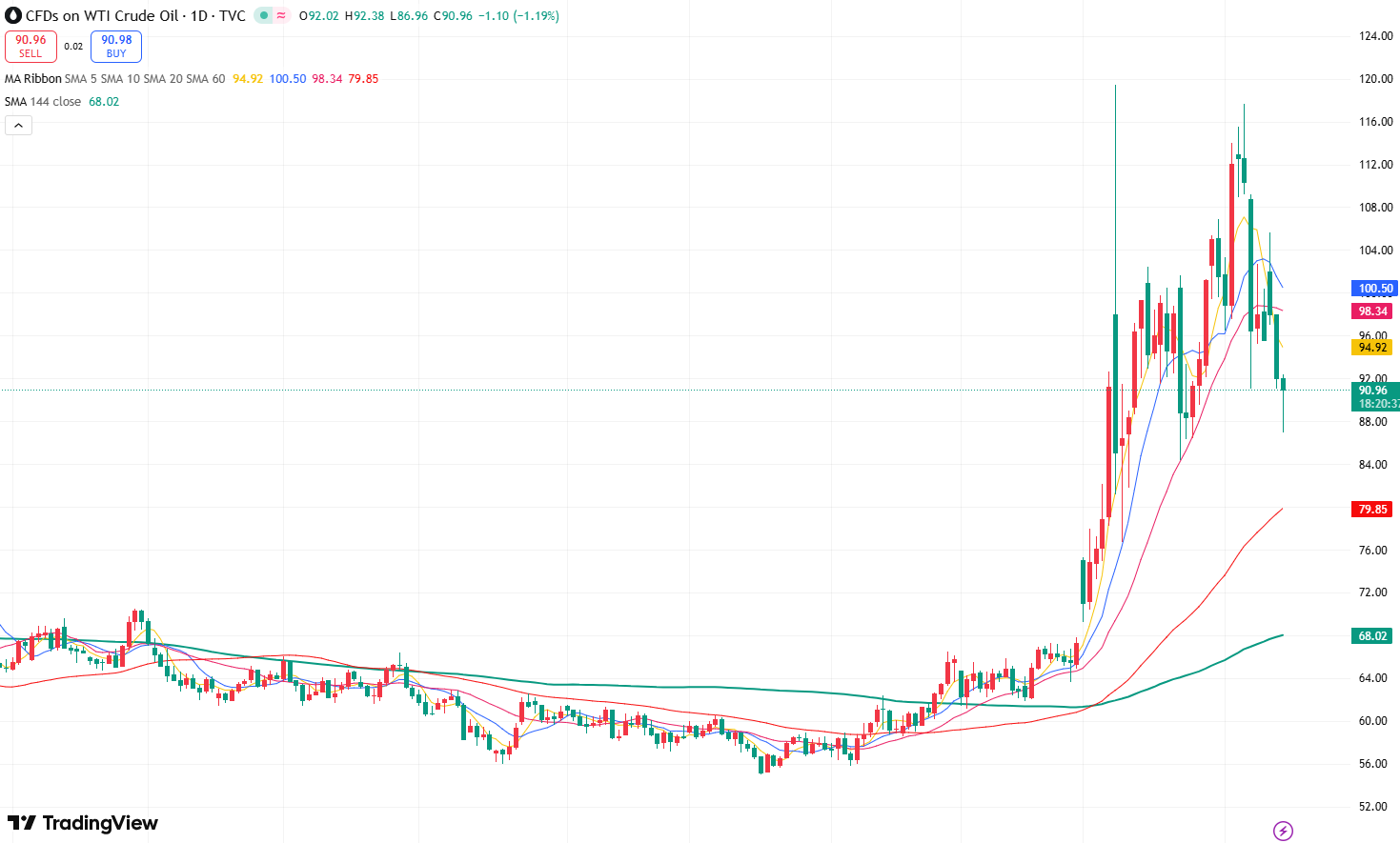 数据显示,截至今日亚市早盘时段WTI原油今日最低跌至86.96美元,目前维持在90美元附近震荡,相比此前因冲突升级而冲上百美元的阶段明显降温。
