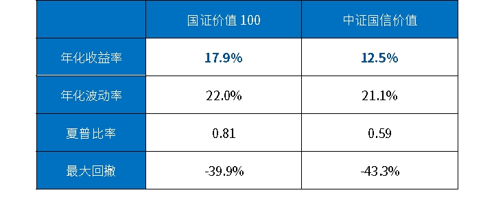 在对比指数时,业绩总是最直观的标尺。自2013年以来,国证价值100年化收益率达17.9%,在波动率与最大回撤相近的情况下,显著跑赢中证国信价值的12.5%;若以累计收益衡量,两者的差距更为明显:国证价值100累计收益为736.5%,而中证国信价值仅为348.3%,前者超出后者一倍有余。