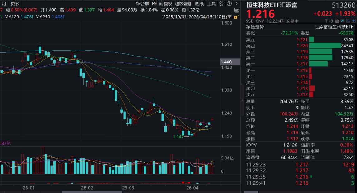今日(4.15),港股科技再迎强劲反弹,100%纯度的港股通科技ETF汇添富(520980)放量大涨超2%,成交额快速突破2.5亿元!同类唯一15BP最低档管理费的恒生科技ETF汇添富(513260)亦涨近2%,昨日再获资金净流入,最新规模超72亿元!