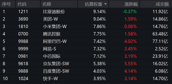 【恒生科技热门成份股涨跌幅】