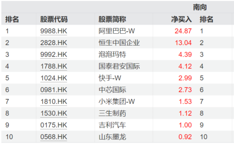 南向资金净买入前十榜单中,阿里巴巴-W以超24亿港元位居榜首,快手-W、中芯国际、小米集团-W分居第5至7位。