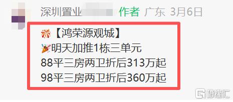 在这过程中,给出的折扣是约89平户型,折后约313万起,是鸿荣源观城推盘以来约89平户型的最低折后总价。