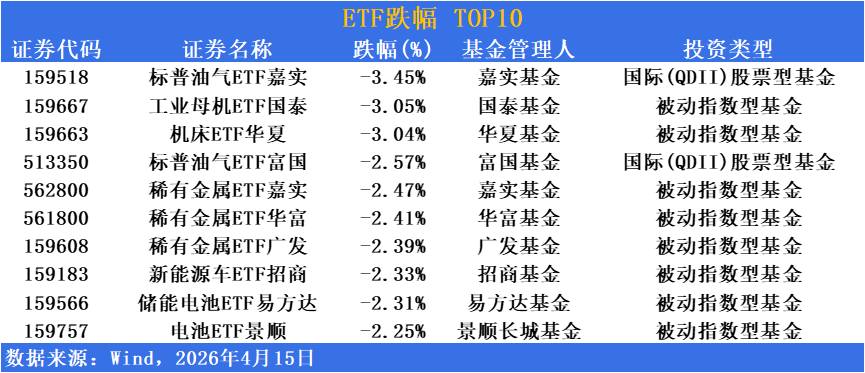 此外,受制造业景气度波动及设备更新政策预期边际减弱影响,工业母机与机床板块同步调整,相关ETF跌幅均超3%;稀有金属板块跟随大宗商品价格回落,多只产品跌幅超2%;新能源产业链上游材料需求预期修正,电池及新能源车相关ETF亦集体下挫,跌幅均超2%,显示资金正从高估值成长板块及周期性资源品方向加速切换。