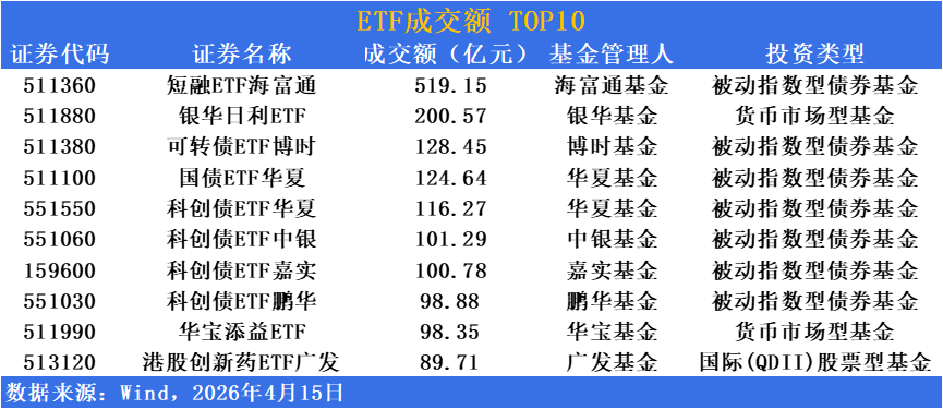 短融ETF单日成交超519亿元位居成交榜榜首,作为短久期信用债工具持续担当资金管理利器,受益于市场资金面宽松背景下的现金管理需求升温。
