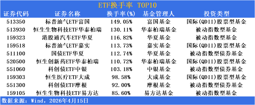 活跃度方面,短融ETF成交超519亿位居榜首,标普油气ETF换手率超149%高居榜首
