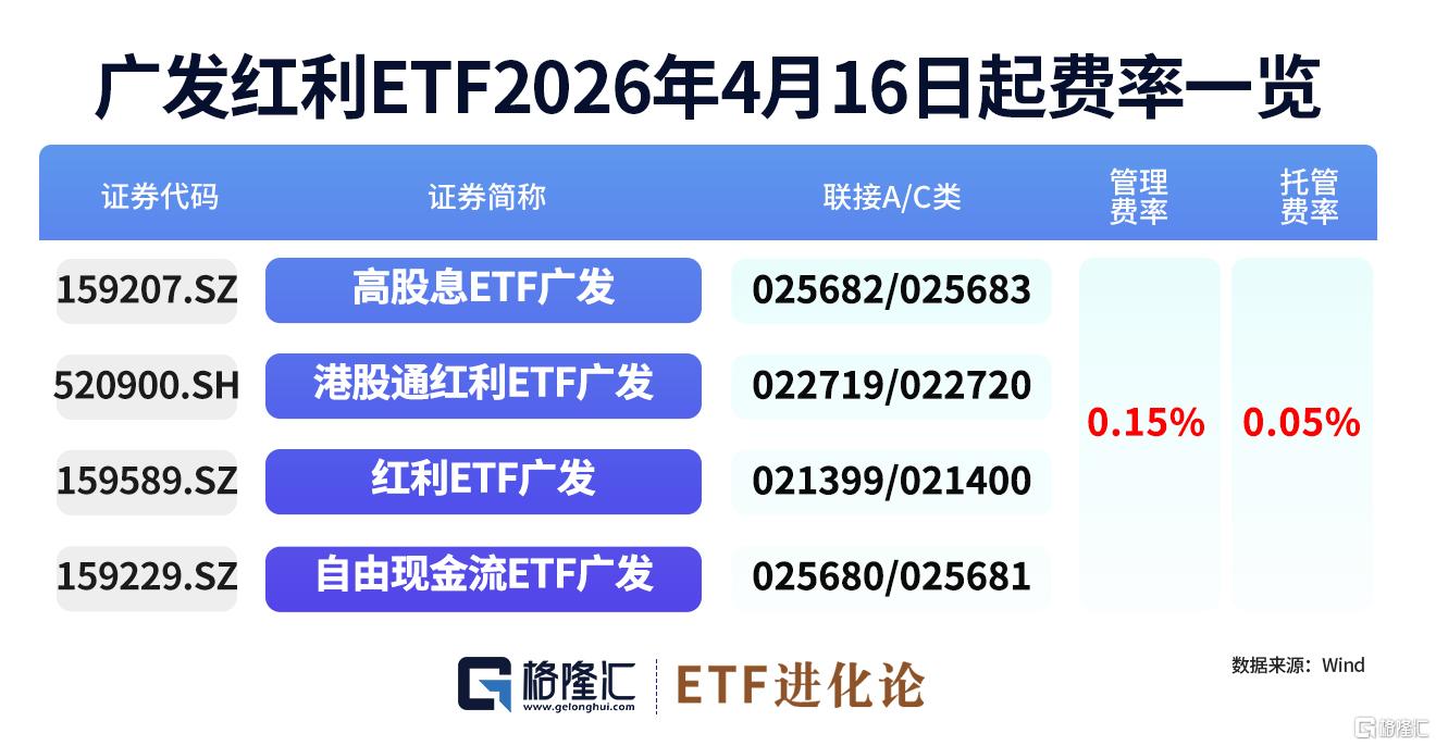 为降低投资者持有成本,4月16日起,广发基金旗下4只红利主题指数产品完成降费,管理费率将由0.5%下调至0.15%,托管费率降至0.05%,进入全市场同类产品的最低费率区间。