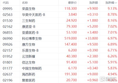创新药概念股强势,荣昌生物涨超9%,华昊中天医药、三生制药、康诺亚、亚盛医药、科伦博泰生物、康方生物等跟涨。